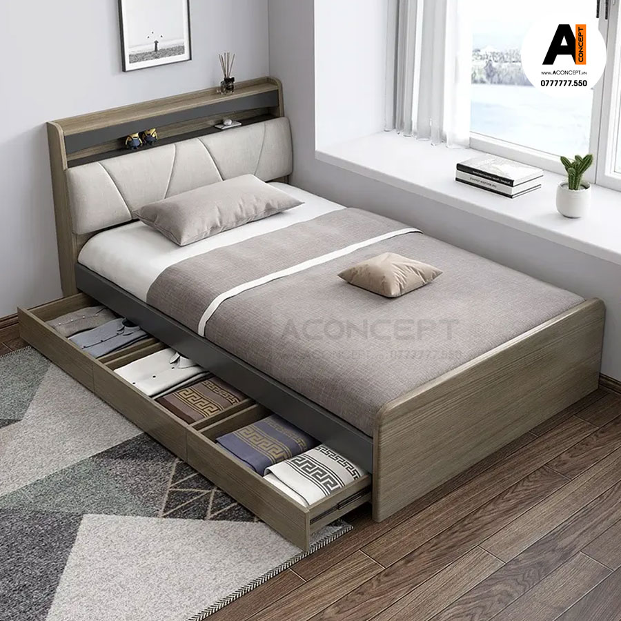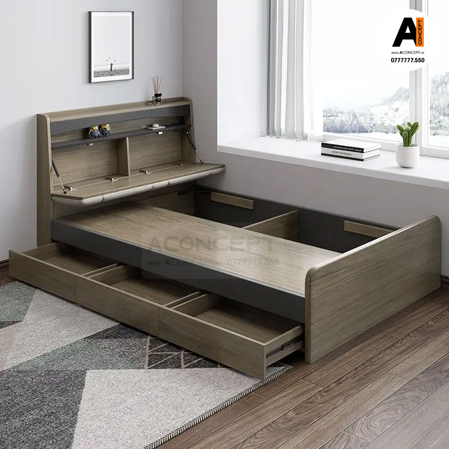 + Giường cao cấp được thiết kế 3 hộc kéo chứa quần áo, đồ dùng cá nhân được tích hợp bên dưới giường nên rất gọn gang và tiện dụng và đặt biệt Giường còn tích hợp thêm 3 ngăn chứa đồ dưới giường, có thể mở lên, xuống dễ dàng, thuận tiện khi sử dụng và tiết kiệm diện tích cho gia đình.